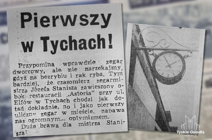 W drugiej połowie lat 60. w przestrzeni miasta pojawił się pierwszy uliczny zegar w Tychach. Został zawieszony przy pracowni zegarmistrza Józefa Stanisza, która znajdowała się tuż obok restauracji „Astoria” przy ulicy Elfów, w pobliżu skrzyżowania z ...